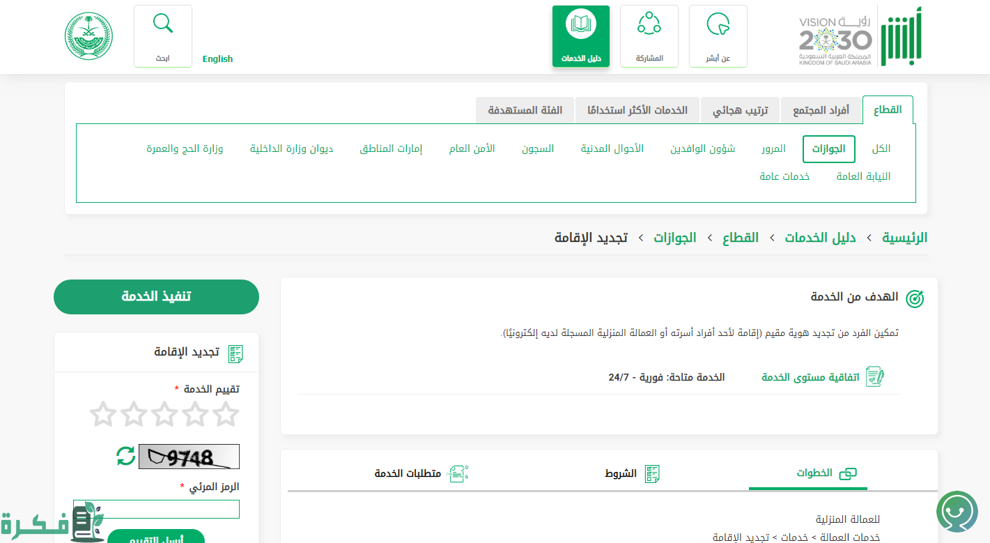 - تنسدل قائمة يتم اختيار” خدمة تجديد الإقامة” منها.
