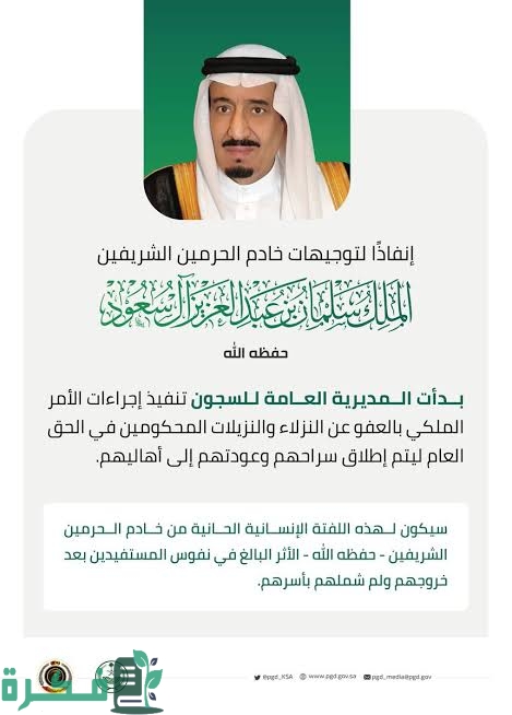 - مع اقتراب قدوم شهر رمضان المبارك قام الملك سلمان بن عبد العزيز آل سعود باصدار عفواً ملكياً عن قائمة من المساجين وذلك على اختلاف التهم والجرائم الذين صدر حكم بالحبس لهم بسببها.