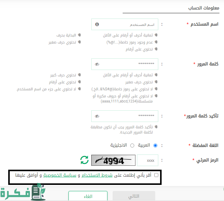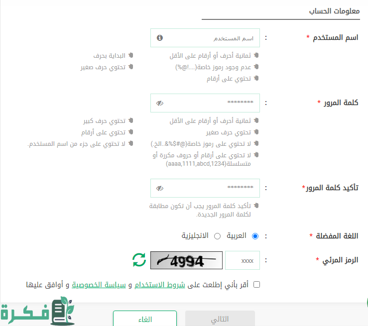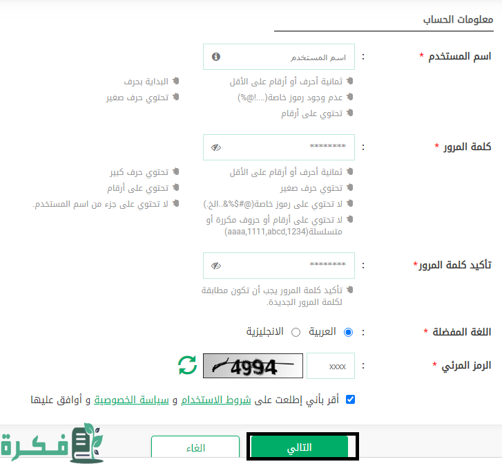 - كتابة المعلومات الخاصة بالحساب مثل: اسم المستخدم، كلمة المرور، تأكيد كلمة المرور، تحديد اللغة، كتابة الرمز المرئي).