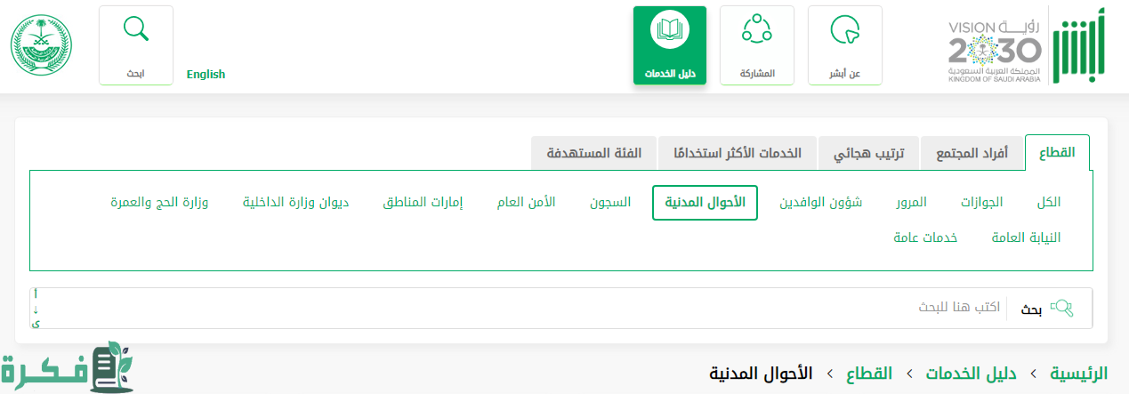 - من خلال زر “القطاع”، اختر “الأحوال المدنية”.
