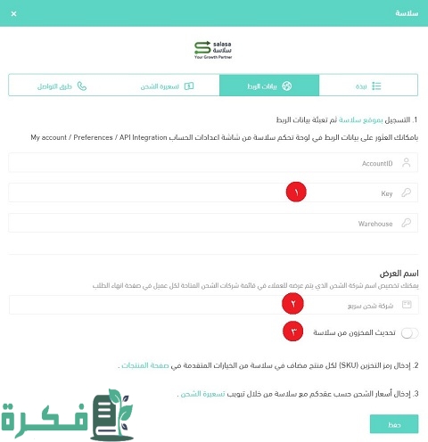 - قم بإدخال بيانات الربط التي تم الحصول عليها بعد التسجيل في الموقع.