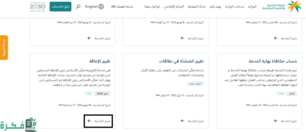 - من خدمة تقييم الإعاقة، الضغط على “شرح الخدمة”.