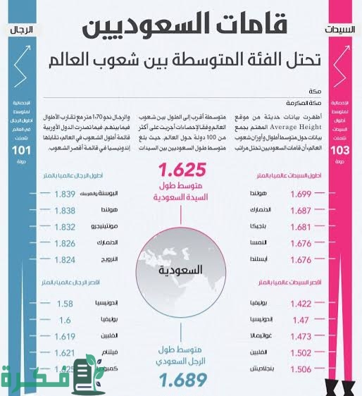 - أن طول الرجل السعودي “بين 167-170 سم”، بينما معدل طول الفتاة السعودية يكون 150 سم وهذا يختلف عن المعدلات العالمية للطول.