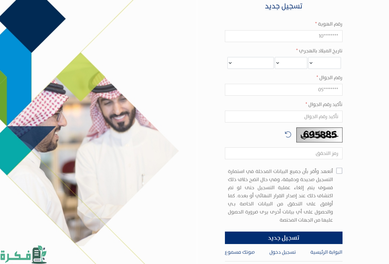 - تعبئة حقول البيانات المطلوبة والتي تشتمل على بيانات مثل تاريخ الميلاد بالهجري، ورقم الجوال، ورقم الهوية الوطنية، ورمز التحقق المرئي.