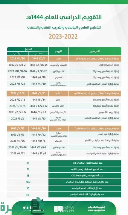 • لقد بدأ الفصل الدراسي الثاني للعام الدراسي 1444 في الرابع من ديسمبر العام 2023 ويستمر لمدة 13 أسبوع وهي المدة لكل فصل دراسي في المملكة.