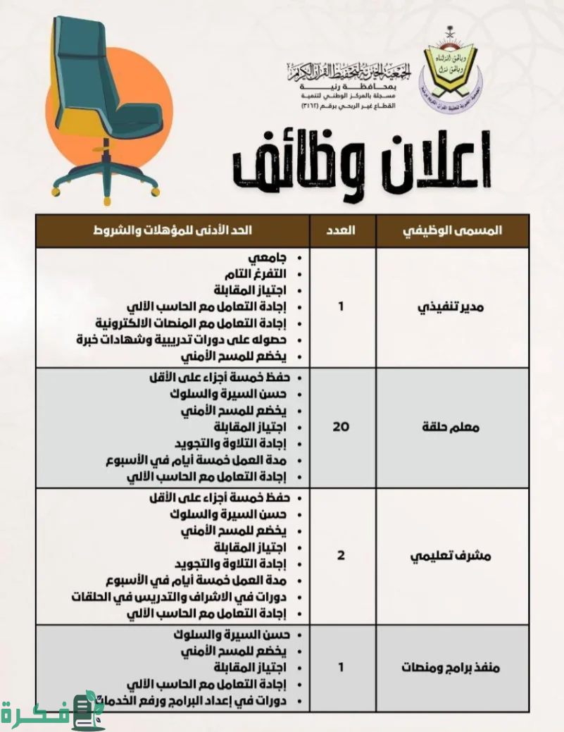الجمعية الخيرية لتحفيظ القرآن الكريم في محافظة رنية أصدرت إعلان ينص على وجود 24 وظيفة شاغرة تحتاج لمن يشغلها شاملة مدير تنفيذي وعشرين معلم حلقة تحفيظ ومشرفين تعليميين ومنفذ برامج ومنصات ولكل مسمى وظيفة شروط يجب استيفاؤها عند التقديم واجتياز المقابلة الشخصية.