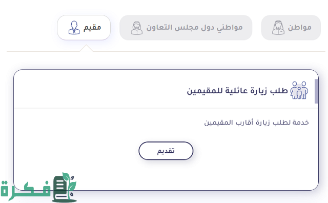 - اختر على أيقونة “تقديم” من خدمة طلب زيارة عائلية للمقيمين.
