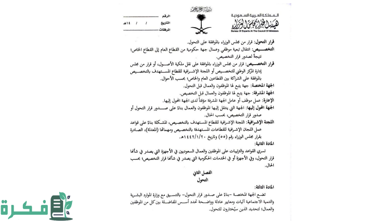 بعد الاطلاع على شرح قرار مجلس الوزراء 616 لعضو الجمعية السعودية للموارد البشرية نوافيكم بأن مجلس الوزراء قد أقرّ بالموافقة على القواعد والترتيبات التي تختص بطريقة معاملة العمال والموظفين في القطاعات التي يتم استهدافها بالتحول والتخصيص وتلك اقرارات نوافيكم إياها كما يلي:
