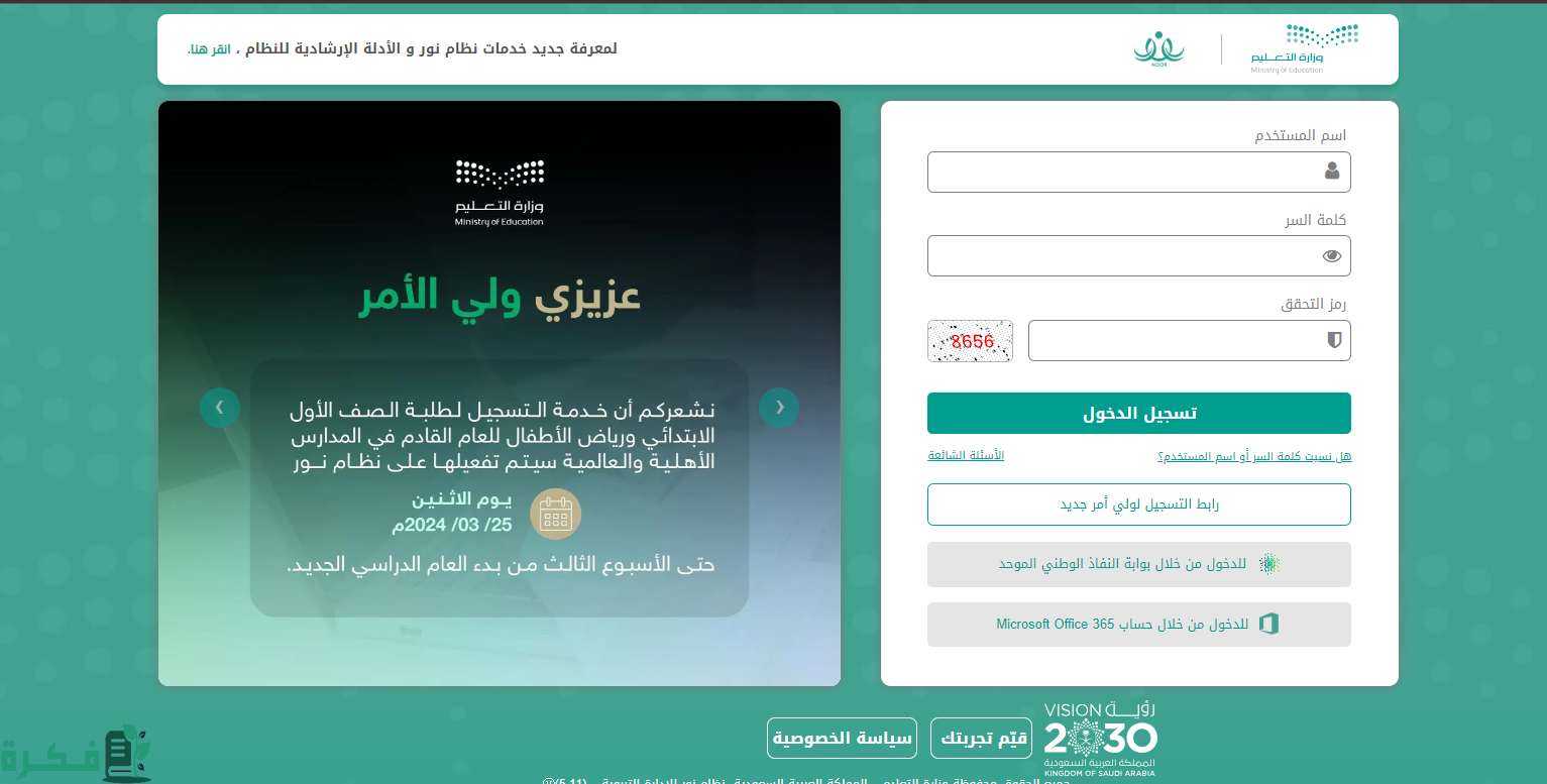 يتيح نظام نور التعليمي للمدرسين وأولياء الأمور، والطلاب الدخول إلى خدماته من خلال بوابة النفاذ الوطني، وذلك باتباع الخطوات التالية: