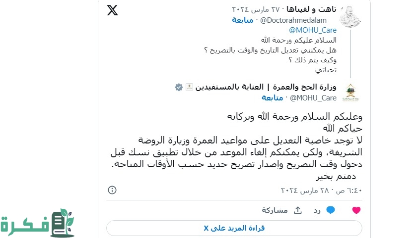تبذل وزارة الحج والعُمرة قُصارى جُهدها لتوفير العديد من الخدمات المميزة للحُجاج والمُعتمرين، بالإضافة إلى الرد على تساؤلات الحُجاج على مواقع التواصل الاجتماعي المُختلفة، حيثُ تلقت الوزارة سؤال عن مدى إمكانية تعديل الوقت والتاريخ في تصريح العمرة.