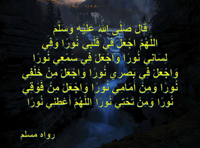 • اللهمَّ اجعلْ في قلبي نورًا، وفي لساني نورًا، وفي بصري نورًا، وفي سمعي نورًا، وعنْ يميني نورًا، وعنْ يساري نورًا، ومنْ فوقي نورًا، ومنْ تحتي نورًا، ومنْ أمامي نورًا، ومنْ خلفي نورًا، واجعلْ لي في نفسي نورًا، وأَعْظِمْ لي نورًا