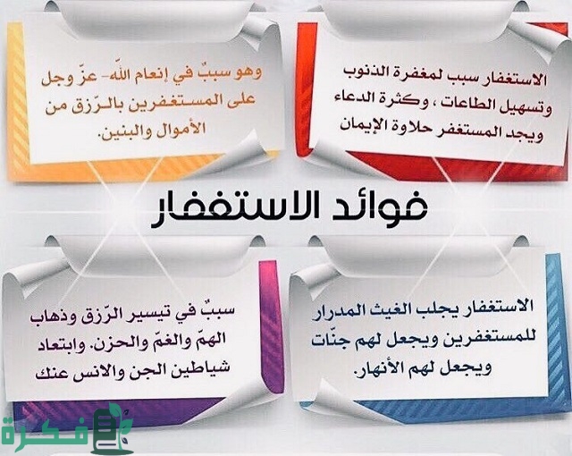 - رفع البلاء: الاستغفار له فوائد عظيمة في رفع البلاء الواقع على المذنبين، حيث قال-تعالى-: “وَمَا كَانَ اللَّهُ لِيُعَذِّبَهُمْ وَأَنتَ فِيهِمْ ۚ وَمَا كَانَ اللَّهُ مُعَذِّبَهُمْ وَهُمْ يَسْتَغْفِرُونَ”.