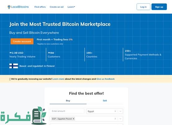 شرح موقع لوكال بيتكوين localbitcoins.com لبيع البيتكوين يمكن الكثير من المستخدمين من جني الربح من خلال الإنترنت بالاستثمار في العملات الرقمية، فهو عبارة عن وسيط بين طرفي عملية البيع، وفي المقابل يحصل على مقابل مادي زهيد كعمولة، لذا فهو أحد أفضل مواقع العملات الرقمية، ونتناول الحديث عنه عبر موقع فكرة.