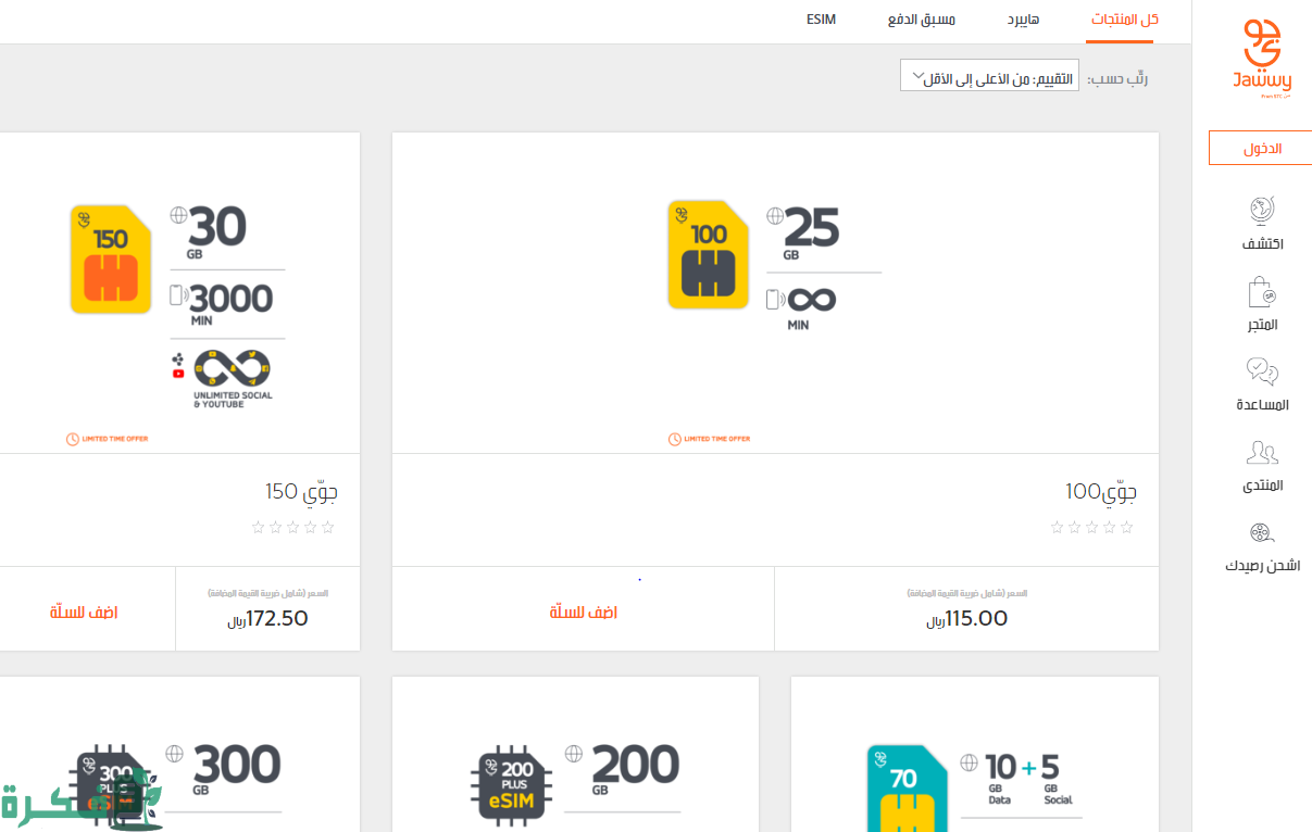 | جوي 150 | 3000 | 45جيجا + إنترنت غير محدود | 172.5 |